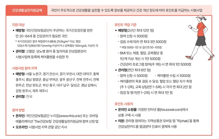 건강생활실천지원금제는 국민이 스스로 건강을 돌볼 수 있도록 동기를 부여하고, 건강을 실천하는 만큼 포인트를 적립해 혜택을 받을 수 있도록 만든 제도입니다.